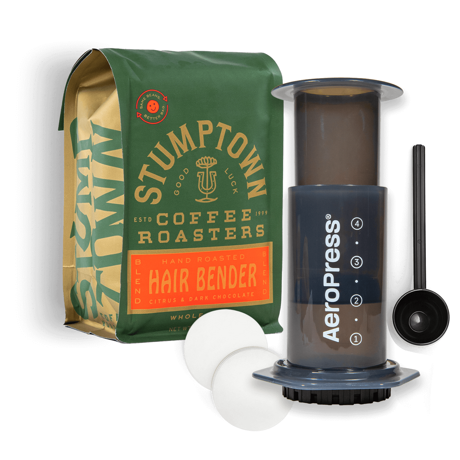 The ultimate bundle for the ultimate outdoorsy type, equipped with a travel-friendly AeroPress brewer and a 12 oz bag of ready-to-brew Hair Bender Blend.